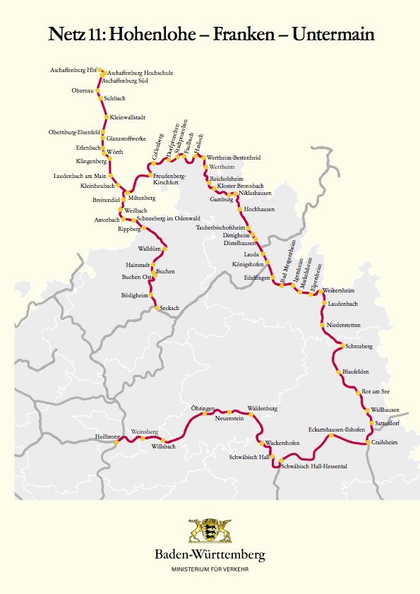 Aschaffenburg Hbf – Miltenberg – Wertheim – Lauda – Crailsheim; Crailsheim – Schwäbisch Hall-Hessental – Öhringen Hbf – Heilbronn Hbf (Hohenlohebahn); Miltenberg – Walldürn – Seckach (Einzelleistungen bis Osterburken). Einzelne Züge werden auch auf der Frankenbahn zwischen Osterburken und Lauda und von Würzburg Hbf über Lauda nach Bad Mergentheim unterwegs sein.