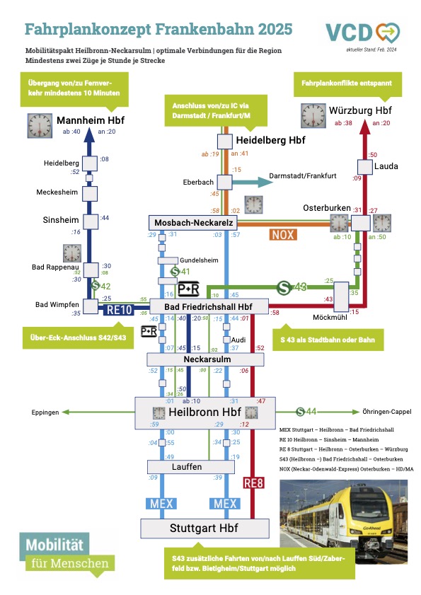 Daher hat der VCD bereits im Frühjahr 2023 in einem Schreiben an die NVBW eine Reihe von Verbesserungen im Rahmen eines Gesamtkonzepts vorgeschlagen. Dazu gehören der Erhalt der bisherigen Fahrplanlage des RE 10 Heilbronn – Mannheim, eine neue S-Bahn-Linie S 43 (Heilbronn –) Bad Friedrichshall – Osterburken sowie eine Führung der MEX-Züge bis Mosbach-Neckarelz, so wie das heute mit dem MEX 12 bereits in der Hauptverkehrszeit der Fall ist. In Mosbach-Neckarelz muss es Anschluss an den geplanten, schnellen RE von Osterburken nach Heidelberg/Mannheim geben. Grundsätzlich kritisiert der VCD, dass im Raum Heilbronn seit Jahren nur der Status Quo im SPNV weiterentwickelt wird und vorwiegend Taktlücken geschlossen wurden. Wirkliche Innovation ist dabei nicht zu erkennen, insbesondere auch nicht im Rahmen des Mobilitätspaktes Heilbronn-Neckarsulm. Zudem hat das Land die Verbindungen auf der Stadtbahnlinie S4 zum letzten Fahrplanwechsel massiv ausgedünnt. Es ist für den VCD daher fraglich, wie das Land Baden-Württemberg mit solch einem Angebot die Fahrgastzahlen im Land in absehbarer Zeit auch nur ansatzweise verdoppeln möchte. Dazu wären aus Sicht des VCD auf allen Strecken rund um Heilbronn, mindestens Halbstundentakte sowohl bei den schnellen Zügen als auch bei den S-Bahnen notwendig.