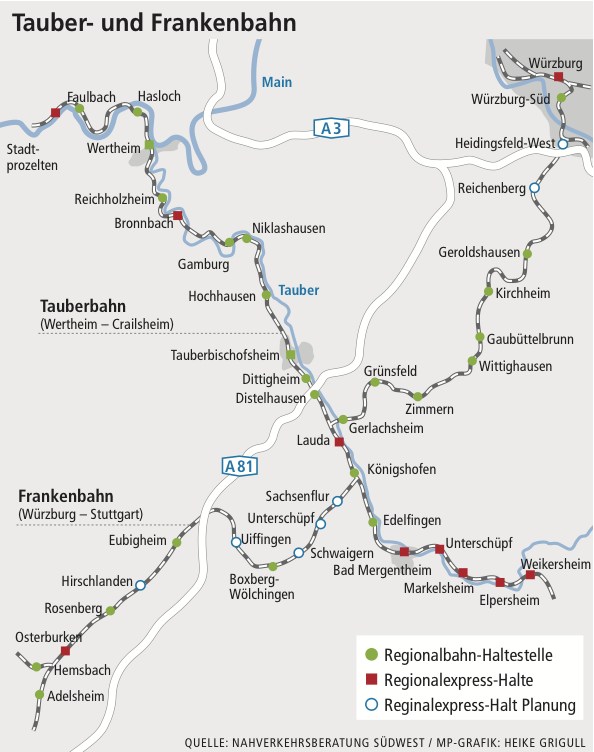 Die Schieneninfrastruktur auf der Frankenbahn von Osterburken bis Würzburg soll verbessert werden. Hierfür setzen sich das Land, der Main-Tauber-Kreis und der Neckar-Odenwald-Kreis ein. Bis zum Jahresende soll für die Finanzierung der wichtigsten Infrastrukturmaßnahmen eine Lösung gefunden werden. Das gab das Verkehrsministerium Baden-Württemberg heute nach Abschluss der Frankenbahn-Konferenz in Lauda-Königshofen bekannt.
